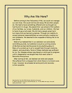 On the day of our first NA meeting, we may have predictions about what our lives will look like without drugs, but what if our dreams don't come true? Desperation has forced us to strive for something new, but what will it be? We now have choices about how we live that we didn't have before, but how do we know which is the "right" path and if we're following our life's "true" purpose? If we don't have a whole lot of faith in the future, how can we get more?